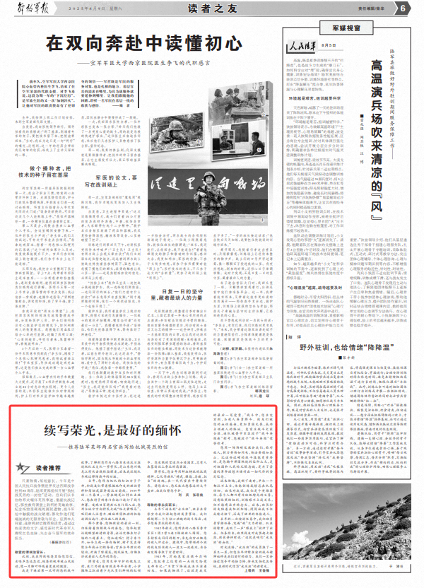 荣耀的延续是最好的记忆 - 对与日本叛乱作战的战争英雄建议,两名官员和士兵被建议,该文件很短,意义很长。今年中国反对日本入侵和世界反法西斯战争的中国战争胜利80周年被标记了。一个特定的陆军部队组织了一份“给对日本斗争的战争英雄的信”。官员和士兵们纪念英雄的作品,并以信件的形式依靠与日本作战的回忆。勇敢的故事在课堂课上听了,斑驳的文物盯着纪念区,战争的烟雾触动了旧战斗场所,这一切都变得永恒的尊重,怀旧从他们的MGA笔流淌。在我的允许下,我选择了两封信将其推荐给读者。通过这些热情的话,我感到了革命的使命和责任在新时代,野性士兵继续他们的红血,并努力加强军队。 。昆虫的声音有时很远,有时会接近,帐篷帆布是由山空气触发的,例如肺叶呼吸着标签的夜晚的水分。这是我在第二家公司之后第一次听到您的战斗故事。我了解到,作为第八陆军第五支队第五支队的营长,前进的第五支队前进了反日期前进的支柱,您是山东德州韦隆吉安格村的伏击之战的指挥官。后来,我和团队一起访问了约会战场。当时,作为专栏中的肠道干部,您和您的同伴用基本区域发行的理论材料和简单的武器冲向了反日战的前线。 1939年的一个春天,一个营在Weilongjiang村申请了一个敌人村庄。在发现日本骑兵打破了东门之后,您用当地方言向村民大喊,“将马匹喂给Taijun”,以吸引敌人的注意力,并秘密地将移动机枪公司移至南门以阻碍敌人的方式。那天晚上,在牺牲之前的最后一刻,您仍然保持警告的姿势。您抬起望远镜看敌人的情况,并永远被冻结在堤墙的第二个悬崖上。你知道吗?现在在村庄的东门外面,建造了一排杨树,树干像士兵的脊柱一样直截了当。当时官员和士兵们一直在沉迷的战es充满了狂野的菊花,改变了空气,仿佛对子孙后代无休止地渴望。您在生活中受到保护的Weilongjiang Village营长Tan。东门外的小麦田现在每年都有金色。鲜红色的疤痕年轻先驱者的ES漂浮在基本学校的操场上。在您永远睡觉的官方烈士公墓中,总会有人在坟墓前从北山东(North Shandong)那里放下高粱酒。营指挥官谭(Tan),鲜血的反日战争精神成为“伟大的武术,强大的能力,诚实和责任”的陪伴,并从一代人的一代军官和士兵中传递出来。请确保我们保护您无数次的和平与繁荣时期。士兵张·西胡恩(Zhang Sihuan)尊重李·杨(Li Yongqing)的负责人:去年,第二家公司参加了“ Yongqing班”,该小队的负责人告诉我们有关您在荣誉室中制造的英雄。我们跟随战斗中令人兴奋的场景,并遵循您的英勇的反日战争。在1942年秋天,第五公司的第二排,第二营,第八路线军队第1卢中央军事区的第一军团,被E围困尼米。用冷灯拿着刺刀,您朝着恶性敌人迈出了第一步。在激烈的战斗中,您带领两个陆军同伴在敌人袭击后承受浪潮,并购买了一个重要的时间来打破全民。 1943年,伊南(Yinan)在huijiazhuang的战斗开始之前,我在我的尸体上唯一拥有的钱就传给了该党秘书的秘书:“如果我不担任职位,我将永远不会重新生活。如果我牺牲了,这是我付出的最后一方。”在战斗中,您向左和向右推,大胆地与敌人作战。我的同伴感染了您的血液,他们变得更加勇敢,无所畏惧,并成功占据了敌人的位置。 Huijiazhuang在战斗中取得了巨大的成功,该公司被授予中央山东中央军事地区“战斗英雄公司”的头衔,您将获得“战斗英雄”的名誉标题。你教我们糟糕的战斗,当面对敌人时,巴奥净应像闪电一样快,标记应像太极山一样稳定。比Mahusay战斗技巧更重要的是,您内心的信仰燃烧,对祖国和人民的无尽忠诚,以及可以为高革命目标支付所有价格的强烈信念。害羞,当我第一次去公司时,我什至无法拿出水平的酒吧,我的体育训练成绩总是走到团队的尽头。班级监视器告诉我我们是英雄主义。每个人都有义务为班级增添荣耀,而无权受膏。是否无法维持培训,但他们可能没有放弃的想法。后来,小队的头和同志陪伴我训练和训练。逐渐地,我不仅认识到自己的分数中的标准,而且成为物理班级专家。在转身时的训练任务中,我们的班级负责散布的活动,突然发现了一个“敌人” b锁火。我躺在排水沟里,大喊“跟随我”,急忙。任务结束后,我得到了同学。当小队的负责人评论时,他说:“这是我们'Yongqing班级'的鲜血。”时间是在飞行,“ Yongqing班级”的成员被单独替换,但是您以前一直是我们前进的战斗精神。我们一定会从您那里拿走指挥棒,继承和推进美丽的传统,并在新时代继续“ Yongqing阶级”的新荣耀。私人王卢尤