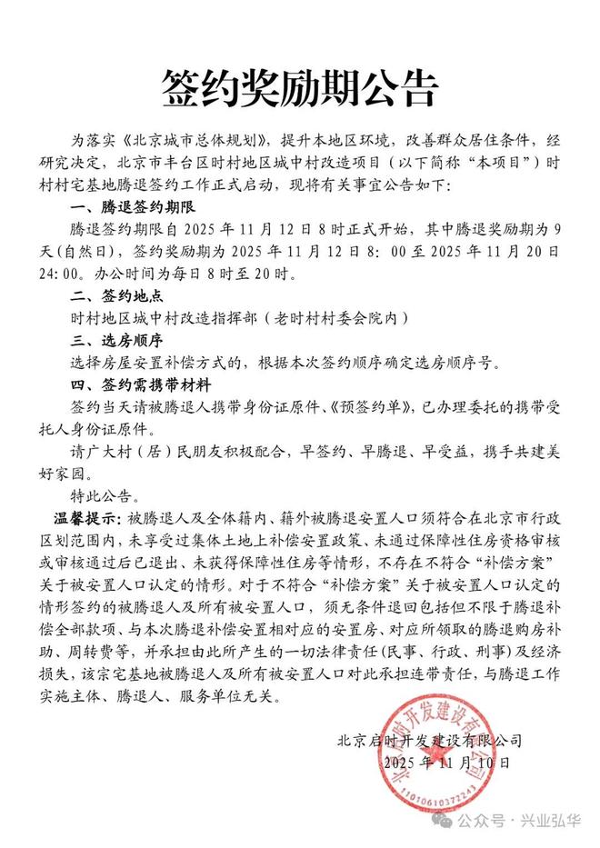 尊敬的朋友们:石村宅基地假期及出发日(自然日)签约时间,签约奖励期为2025年11月12日8:00至2025年11月20日24:00。办公时间为每天8:00至20:00。 ➠ 签约地点为石村区城中村改造办公室(老石村委会院内) ➠ 如果按照选房顺序选择房屋安置补偿方式,则按本签约顺序确定选房顺序号。 ➠签订合同所需文件。签字当天请携带空出人员身份证原件和《预签表》。受委托人须携带受托人身份证原件。石村片区城中村改造项目是我市第二批城中村改造项目之一。项目的实施将消除老寮的安全隐患完善片区基础设施建设,弥补基础设施不足,让居民从“忧居”变为“好居”。项目的实施还将释放南中轴地区的部分土地资源,重塑城市形象,有利于提升南中轴沿线的功能和形象。 。 ■ 注:本文由丰台编辑发表。转载或摘录必须注明某些图片的来源来自互联网。版权归原作者所有。如有违规,请联系我们删除 ■ 来源:兴业宏华 ■ 法律顾问号:北京恒略律师事务所。咨询微信:jwbei2========丰台人民邻居圈子! ======